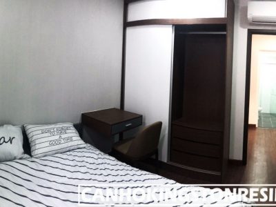 Nép mình gọn gàng gần cửa chính, theo góc chữ L của căn hộ là khu vực của phòng bếp. Tủ kệ bếp màu gỗ trắng tạo cảm giác sạch sẽ, tinh tươm kèm mặt bếp trắng trang nhã. Được trang bị những đồ gia dụng cao cấp cho một gian bếp hiện đại. Phòng ngủ với diện tích hợp lý trang bị đầy đủ các nội thất giúp chủ nhân căn hộ thuận tiện trong sinh hoạt. Sàn phòng ngủ bằng gỗ cao cấp hài hòa với tủ đồ, bàn làm việc đơn giản hiện đại.