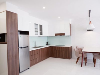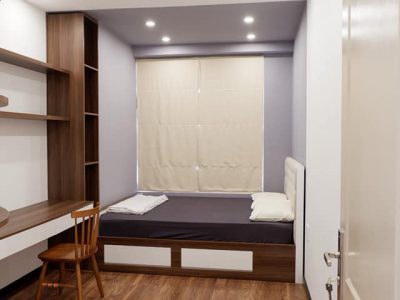 Nép mình gọn gàng gần cửa chính, theo góc chữ L của căn hộ là khu vực của phòng bếp. Tủ kệ bếp với màu tinh tế tạo cảm giác sang trọng, tinh tươm kèm mặt bếp trắng trang nhã. Được trang bị những đồ gia dụng cao cấp cho một gian bếp hiện đại. Phòng ngủ với diện tích hợp lý trang bị đầy đủ các nội thất giúp chủ nhân căn hộ thuận tiện trong sinh hoạt. Sàn phòng ngủ bằng gỗ cao cấp hài hòa với tủ đồ, bàn làm việc đơn giản hiện đại.